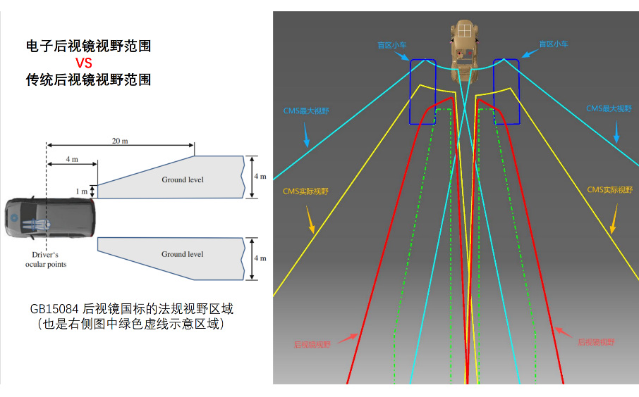 针对传统后视镜的盲区问题,傲目 EYEX 通过光学与算法融合优化,在满足国家标准 G 15084-2022 的前提下,实现视野范围的进一步拓展。实验数据显示,其右侧有效可视范围最高可提升至传统后视镜的 3.3 倍,使驾驶者在变道与超车等关键场景中具备更完整的信息感知能力。